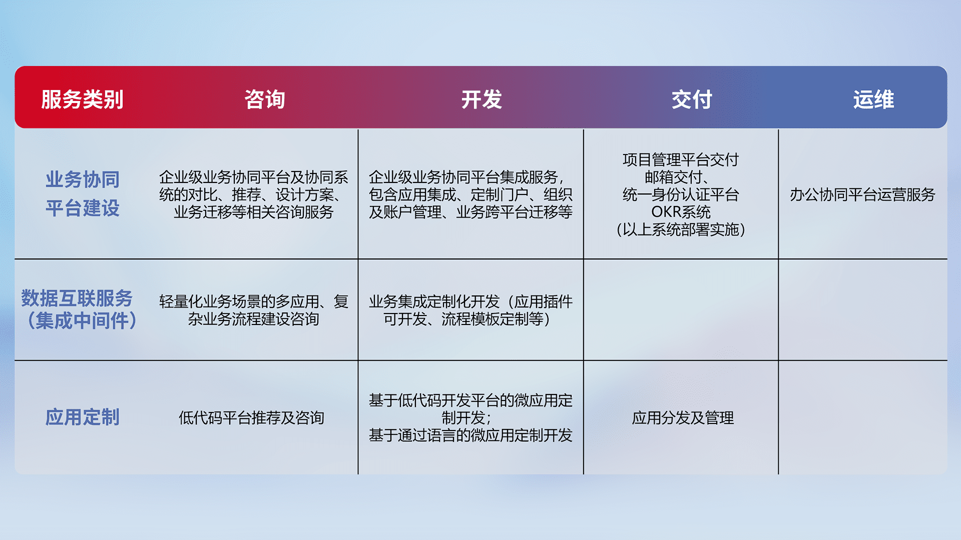 针对钉钉、、企微、、IDaas等平台级产品提供产品的规划、、、方案、、、、交付、、定制化开发等服务,,,,实现如统一协同办公、、、、智能客户服务、、混合会议管理、、、智能数据查询、、、等业务场景,,,实现数字化转型。。。