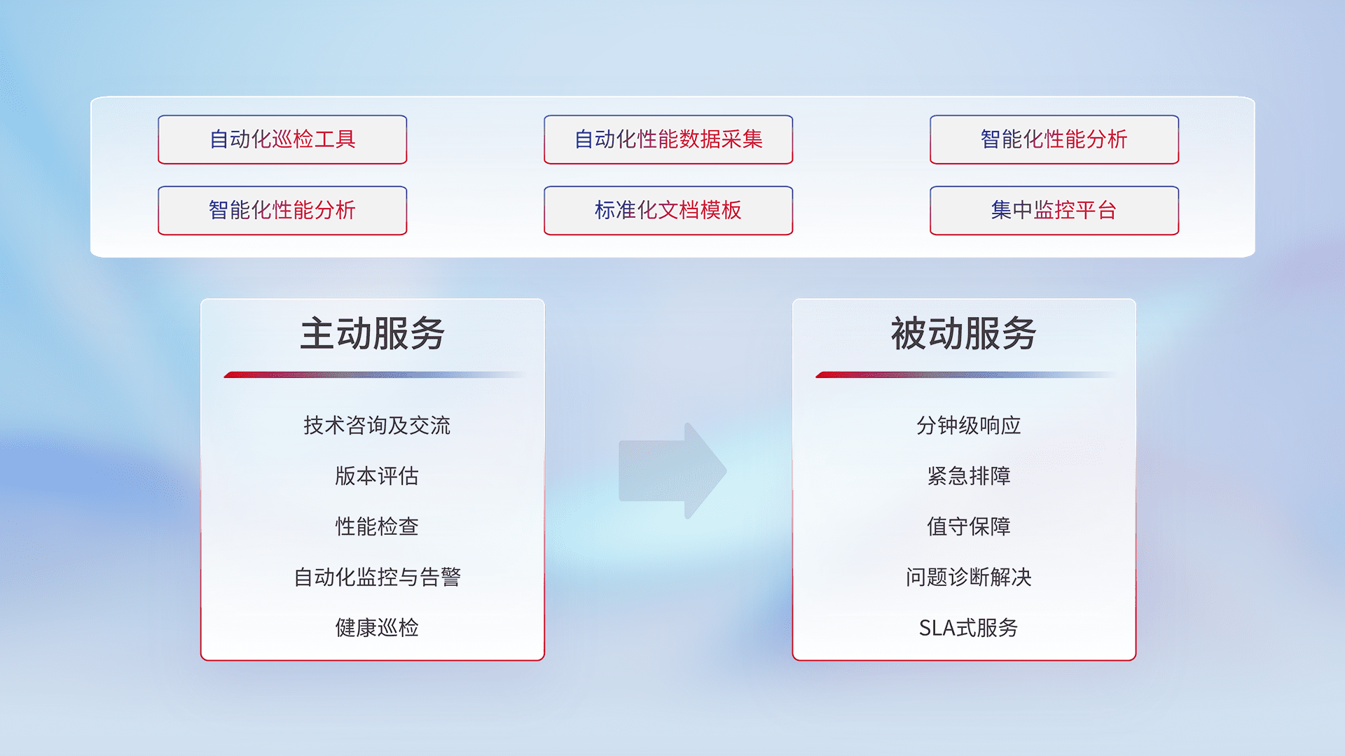 智能化工具和标准化文档,,,,保障服务质量,,,,提供主动服务(包含技术咨询、、、版本评估、、、、性能检查、、自动化监控与告警、、、、健康巡检)和被动服务包含(分钟级响应、、、紧急排障、、、、值守保障、、、、问题诊断解决、、SLA服务)。。。。